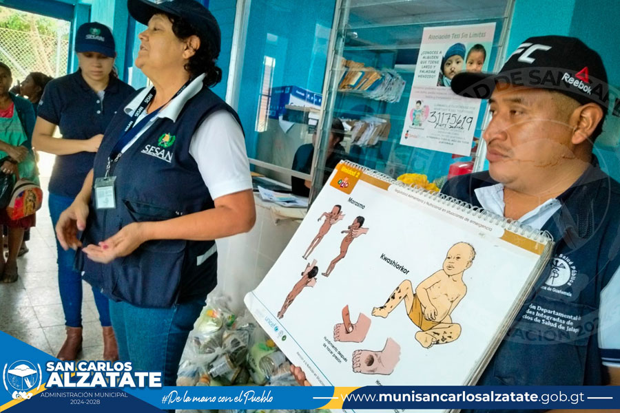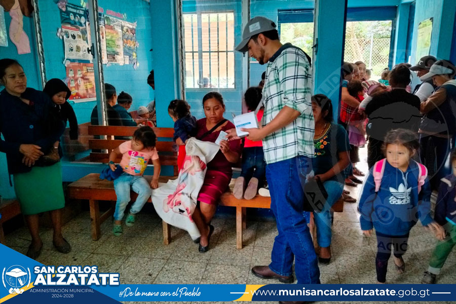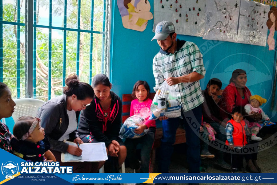 Gracias a las gestiones de la Municipalidad y el apoyo de instituciones como Fundación Azteca y Plan International, se realizó la entrega de alimentos, vitaminas y bolsas de chispuditos a madres de niños con bajo peso en diversas comunidades de San Carlos Alzatate.